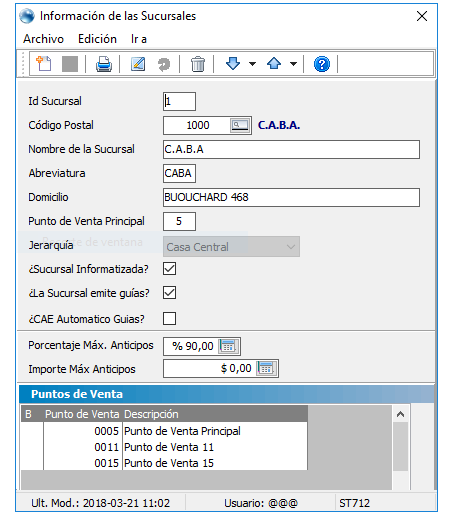 Opcional: en la opción Información de las sucursales, habrá que dar de alta el nuevo punto de venta. Este paso no es fundamental, pero es más prolijo para poder ver una descripción del punto de venta al momento de utilizarlo (por ejemplo, al facturar). A continuación vemos una sucursal con más de un punto de venta habilitado: