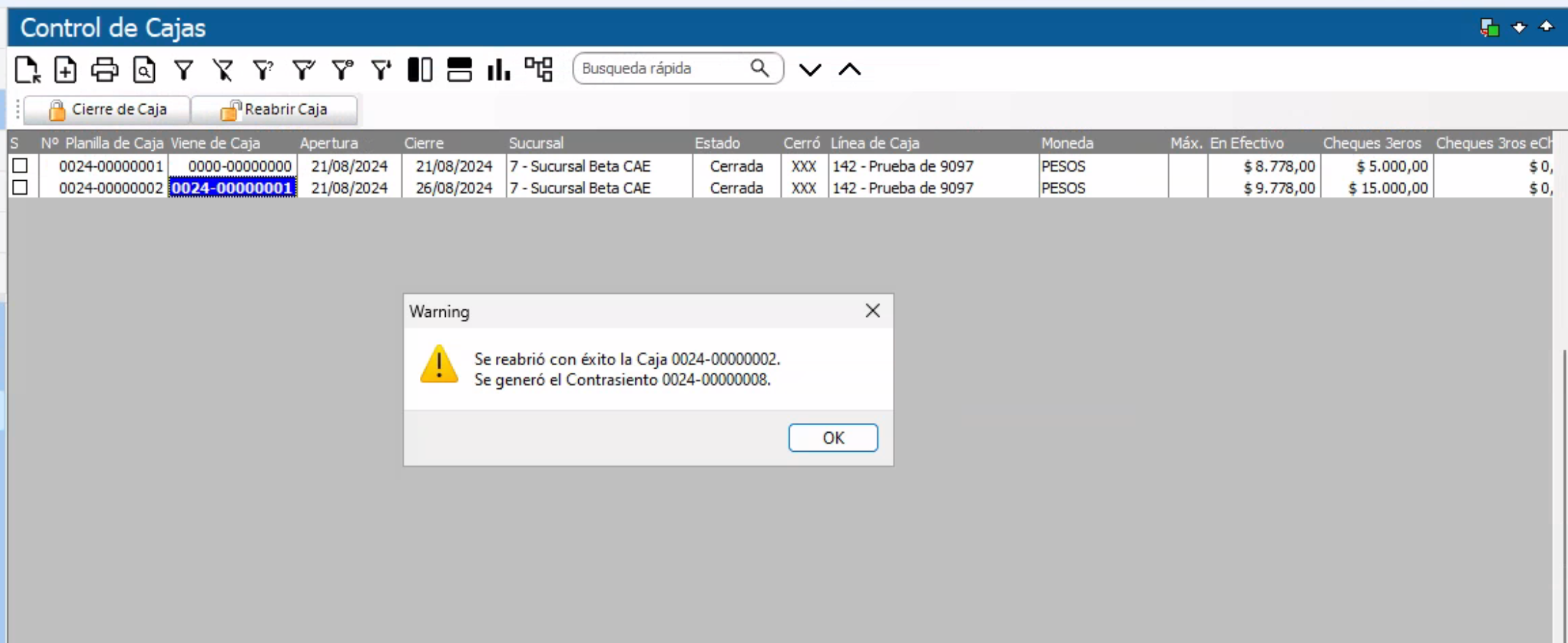Se permitirá reabrir con la condición de que sea siempre la última planilla de caja y no se haya abierto otra posterior al cierre.