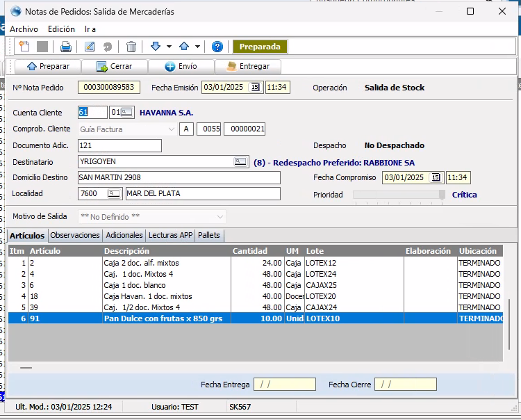 Realizar la salida de stock de la mercadería pedida por el cliente, para entrega o retiro desde el almacén.