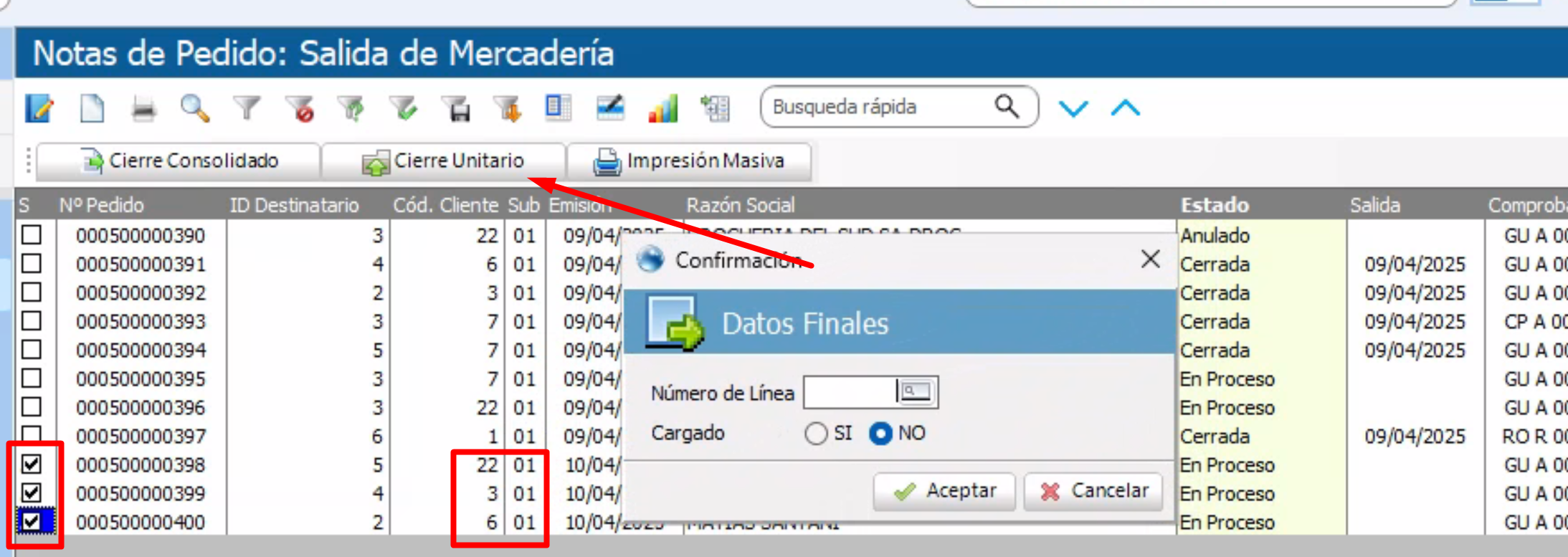 A través del botón CIERRE UNITARIO a la derecha de CONSOLIDADO en la barra principal de la opción, invocara a este proceso y procesará a todas las Notas de Pedido tildadas. Para cada una de ellas, generara un Carta de Porte/Guía INDIVIDUAL sin agrupar su contenido. En este caso no es necesario que se trate siempre del mismo cliente como en el cierre consolidado, puede ser cualquiera.
