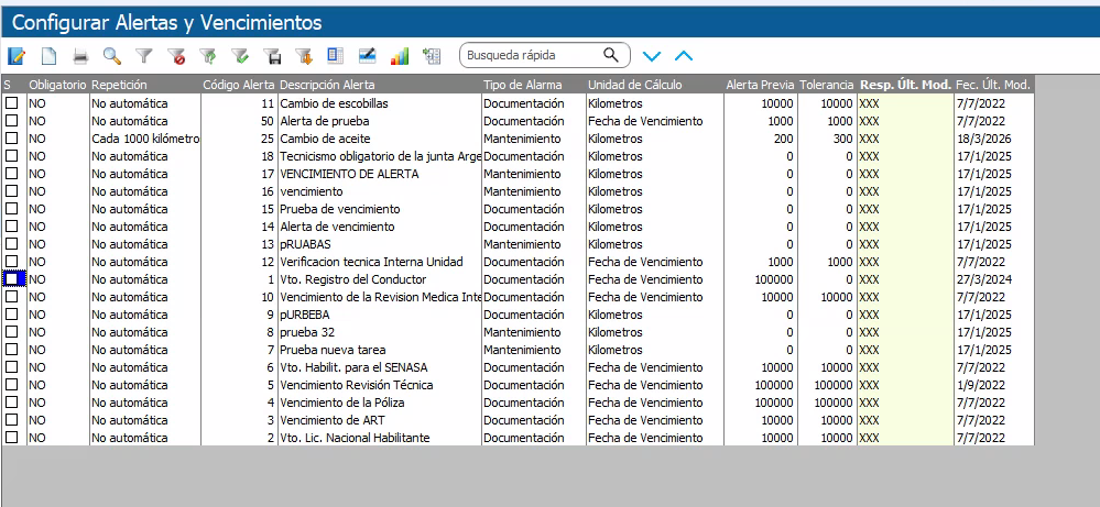 Lo mas importante, si se tilda Tipo de Alerta Obligatorio significa que SI o SI tiene que informase el valor de esa alerta en todas las unidades o Choferes(sea Fecha o Kilómetros) para poder ser evaluados. Si no lo informas, no dejara operar con esa Unidad/Chofer. En todo caso no tildar que sea OBLIGATORIO. En ese caso permitirá seguir sin el valor y solo lo evaluara cuando realmente se produzca un vencimiento. En caso de necesitar la alerta pero que no frene la operación, simplemente se debe modificar la tolerancia, esto extiende la obligatoriedad de actualización del dato.