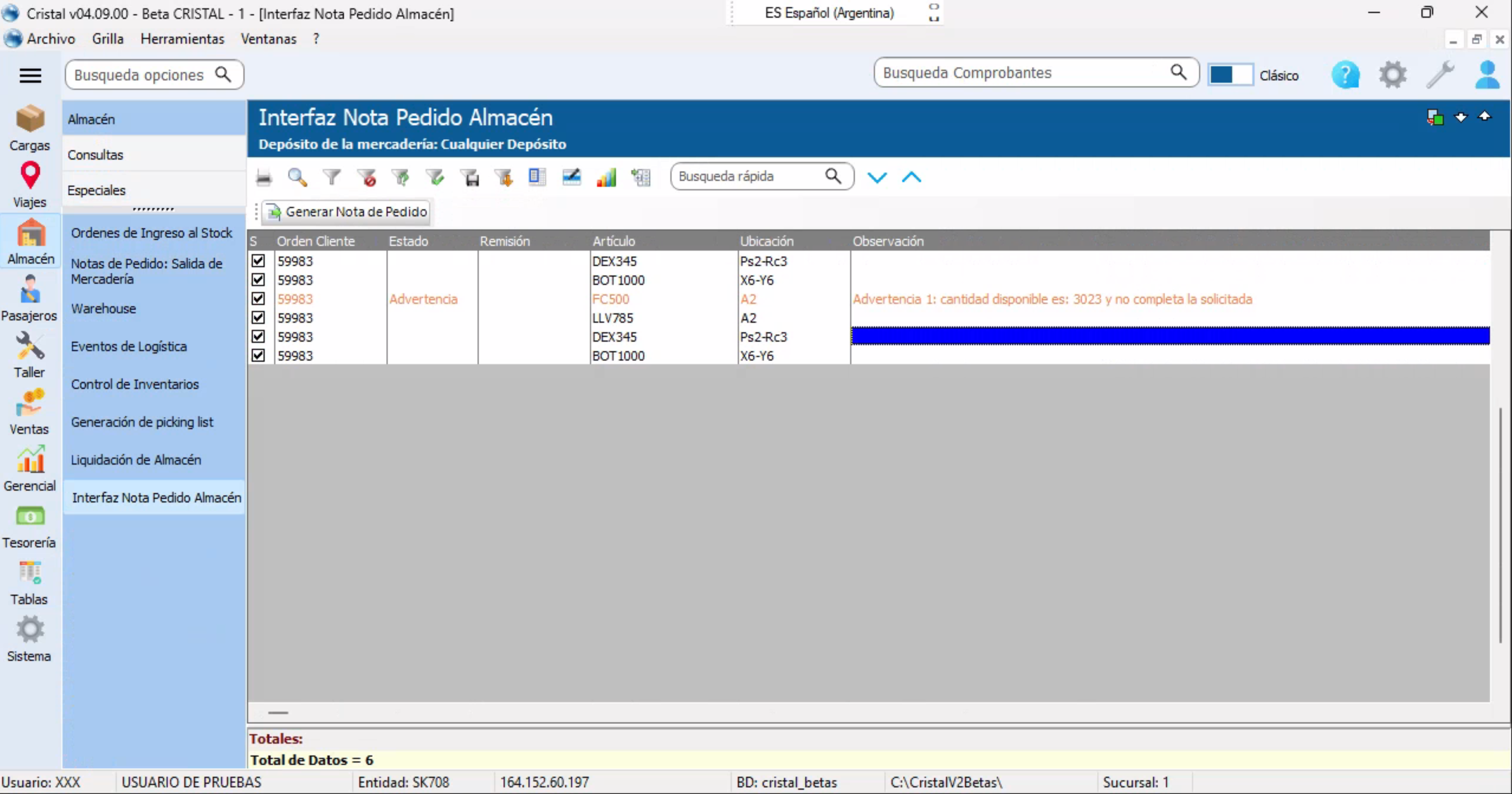 En caso de tener algún error o "Advertencia", se informa en la columna "Observaciones". Ej: Si la cantidad solicitada en el archivo, supera la cantidad disponible en sistema, se informará este caso indicando la cantidad