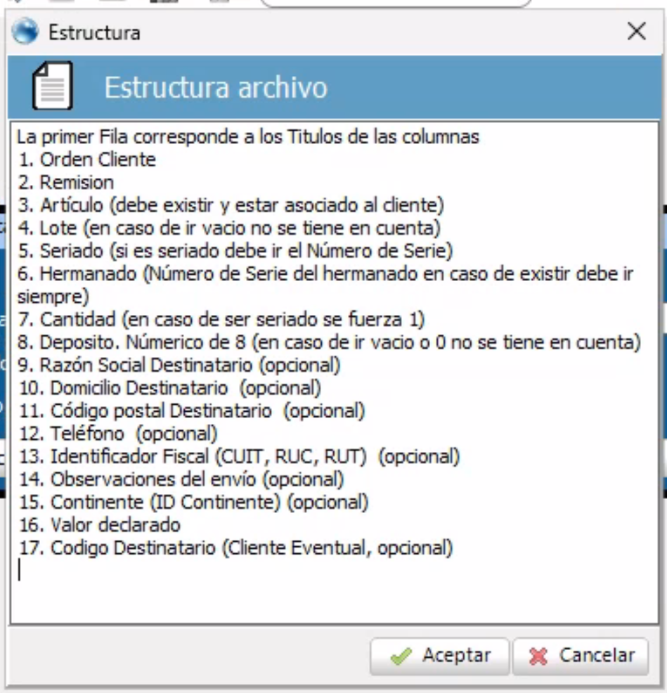 En la cual se debe seleccionar el cliente, el archivo TXT a importar, el separador como así también el deposito. El archivo a importar debe contar con la siguiente estructura:
