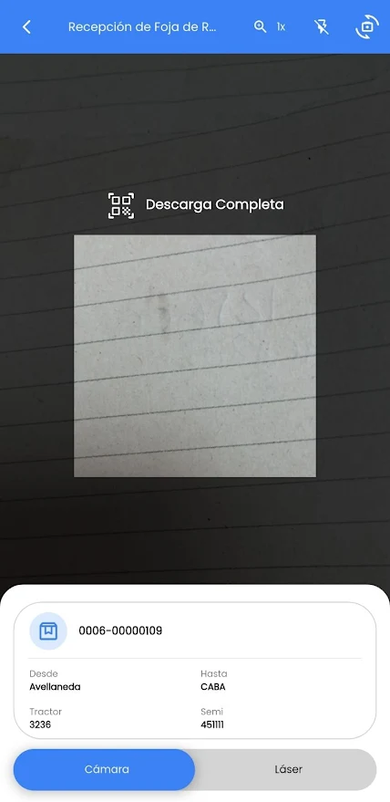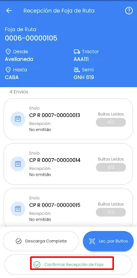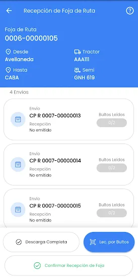 Al llegar la unidad a destino, se solicita el número de foja de ruta que se recibe y la aplicación permitirá leer las etiquetas mientras se descargan.