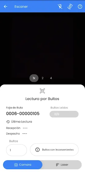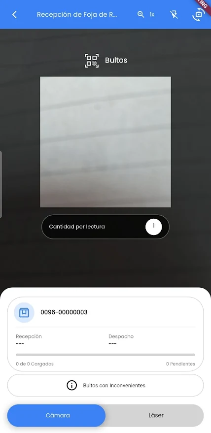 Desde esta pantalla podremos empezar con las lecturas presionando el botón "Lectura" que nos abrirá la pantalla para las lecturas donde se puede configurar la cantidad de "Bultos a Leer" y presionando el botón "Escáner" se abre el Lector de códigos QR desde el cual se podrá leer el código QR correspondiente al Rótulo de Recepción que deseamos chequear en la Foja.