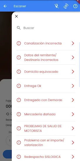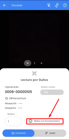 Mediante este botón podemos informar si la recepción de un bulto tiene inconvenientes. Para ello se abre una pantalla donde se puede seleccionar los diferentes motivos (mismos que se usan en Cristal Desktop) y la pantalla de lectura cambia a estado "Con inconvenientes" mostrar el botón de "Bultos con Inconvenientes" en rojo y debajo de la "Última lectura" un tilde con la descripción del inconveniente seleccionado.