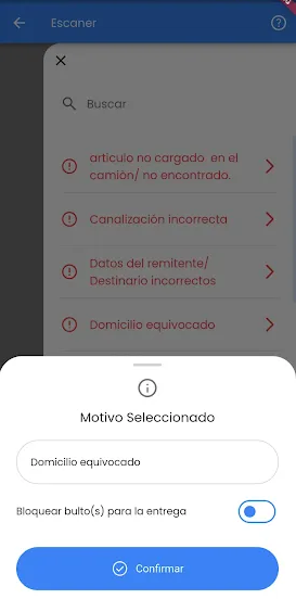 Al elegir un Motivo se puede agregar una Observación (por defecto la descripción del motivo) y tildar los Bultos como Bloqueados para la Entrega.En caso de querer dejar de informar los Bultos con Inconvenientes solo debe hacer Tap en el Tilde del Inconveniente o seleccionar nuevamente "Bultos con Inconvenientes" y en vez de elegir un motivo hacer Tap en el boton "Cancelar". De esta manera el boton "Bultos con Inconvenientes" debe volver al color celeste inicial y ocultarse el tilde con el inconveniente.DESCARGA COMPLETA: