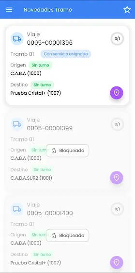 Cuando se accede a la opción, la aplicación mostrará todos los Viajes con Tramos asignados al Chofer logueado. Por cada Viaje se muestra el Tramo Activo y al que le falte informar alguno de los horarios en Origen o en Destino.