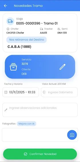 Por defecto ya está cargada la fecha y hora actual, pero el chofer podría actualizarla de ser necesario. Además de añadir observaciones, editar Odómetro e agregar Fotografías que luego podrán consultarse desde Cristal Desktop. (ver ¿Dónde veo las observaciones de las Novedades de Tramo?)