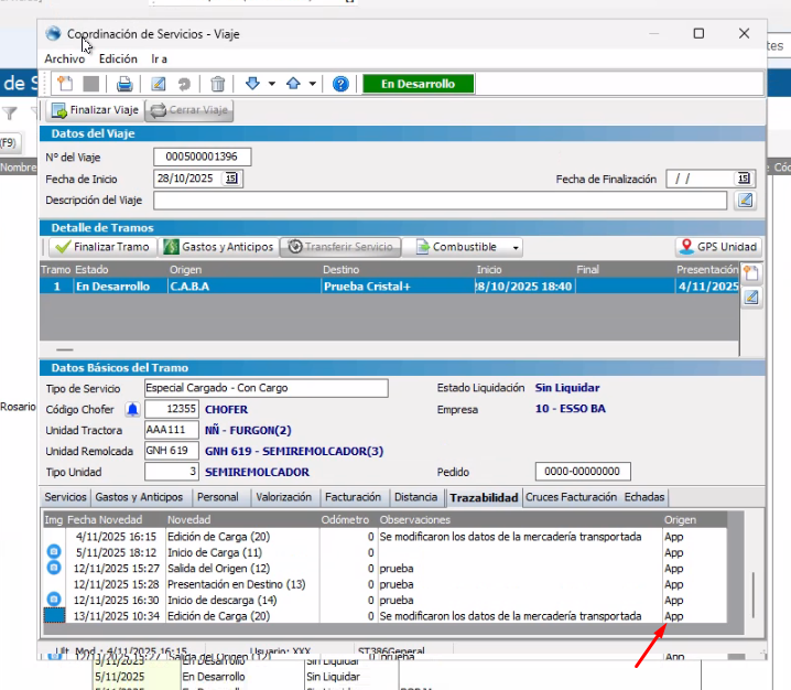 El chofer ingresará los datos solicitados de todas las novedades del tramo, estos quedaras asociados al mismo y consultados desde Cristal Desktop en la solapa "Trazabilidad"