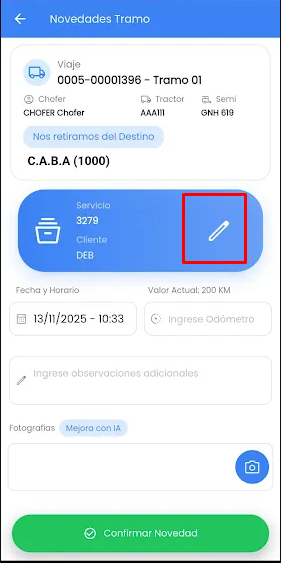 Además, si el Tramo contiene un Servicio Asignado el mismo podrá editarse: