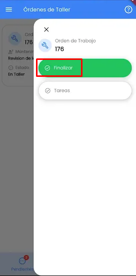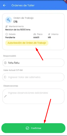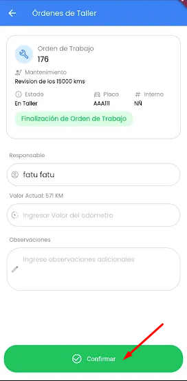 Finalizadas todas las tareas que se incluyan en la OT, solo restaría Finalizar la OT, completando los valores de Responsable de la tarea (por default se completa con el nombre del usuario logueado en la app), odómetro y observaciones adicionales