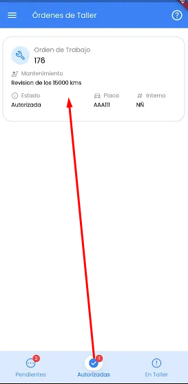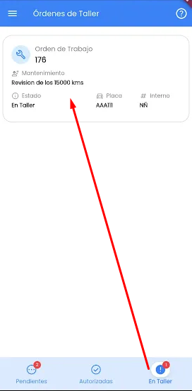Tanto en Pendientes como en Autorizadas, solo podremos consultar las tareas incluidas en la OT. La carga de horas solo puede realizarse cuando la OT se encuentre En Taller. Ver imagen ejemplo: