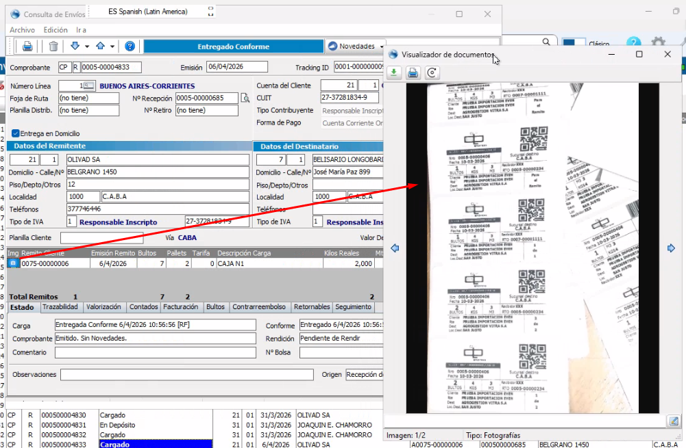 La finalidad de este agregado es la de informar estos datos en envíos que son "Retirados en depósito", es decir que se informan sin entrega a domicilio y "Cargado NO" porque los clientes pasan a retirarlos.- Desde Cristal Desktop podremos ver la documentación desde el icono de imagen, situado en el apartado del remito. Además la guía pasa a estar Entregada Conforme en caso de que hayamos optado por informar esta novedad: