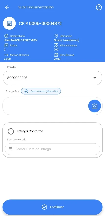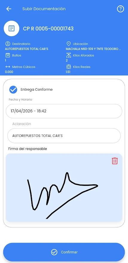 3. Opcionalmente podremos confirmar la entrega conforme al momento de confirmar la subida de la documentación, pudiéndose editar fecha hora y receptor de la entrega.