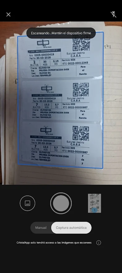 Con esta opción administrativa de Cristal App disponible para usuarios de tipo "usuario" vamos a poder leer comprobantes (por QR), escanear la documentación necesaria para ese comprobante y confirmar la entrega al momento de realizar la subida de la documentación.
