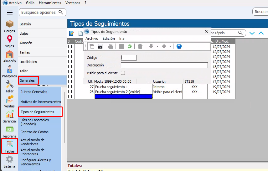 2) Los Tipos de Seguimientos se cargarán en una nueva opción llamada justamente "Tipos de Seguimientos", allí podremos crear todos los que necesite la empresa, indicando si el mismo es Visible o NO para sus clientes. Por defecto en dicho maestro se creará el código = 1 que se llamará "Información General" que será no visible para el cliente, todos los Seguimientos ya creados se cargaran por defecto con este tipo de seguimiento.