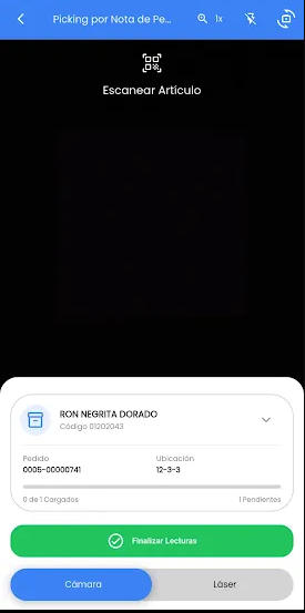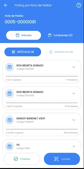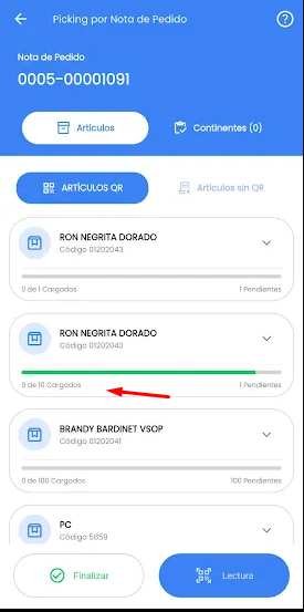 Podrá chequear el progreso de la nota de pedido, ya que se contabiliza lo que se fue pickeando y lo que tiene pendiente de hacerlo. Esto es tanto en el transcurso de las lecturas como en la grilla de información general