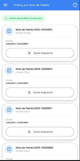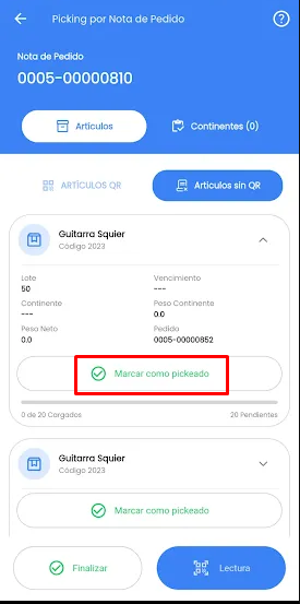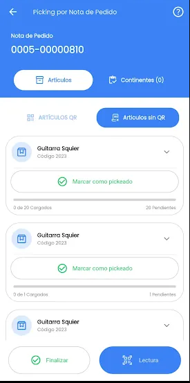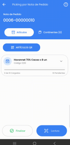 Cuando un pickeador selecciona una NDP, podrá empezar a cargar los articulos asociados a dicho comprobante