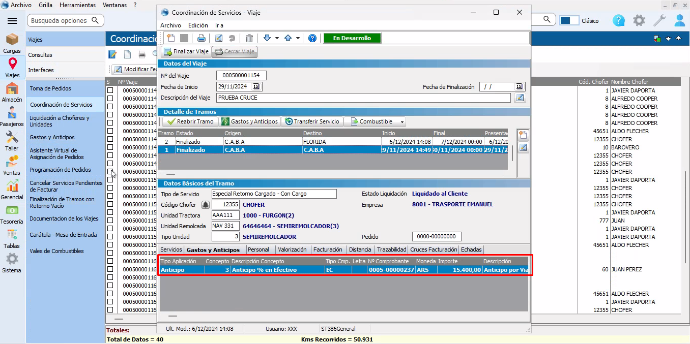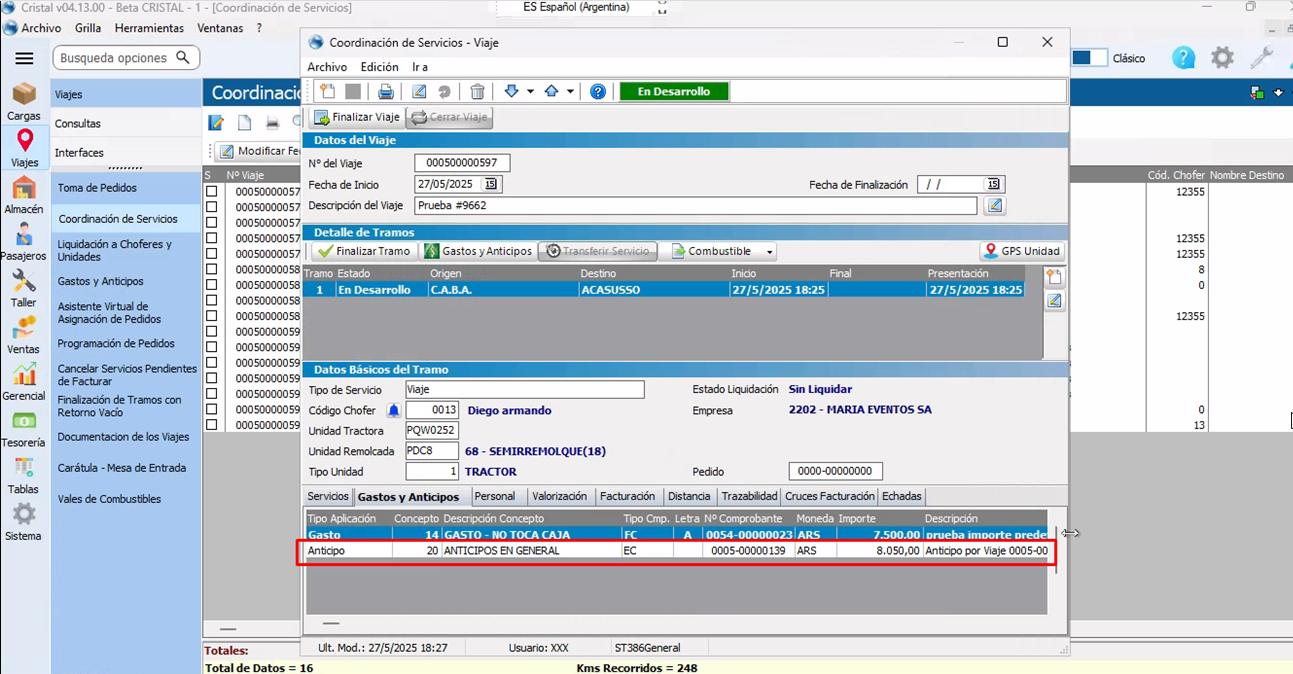 Entonces, al guardar se verá impactado en el viaje seleccionado: