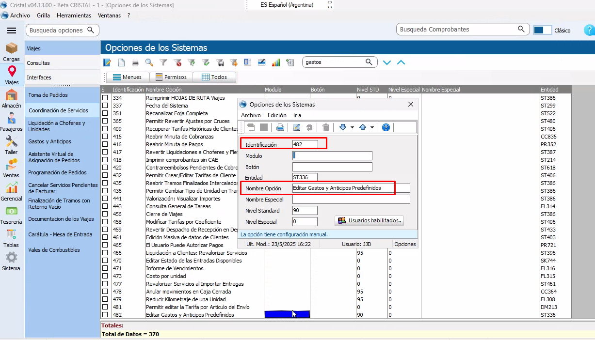 El permiso creado tiene el código 482 - Editar Gastos y Anticipos Predefinidos, y podrá editarse desde Opciones del Sistema: