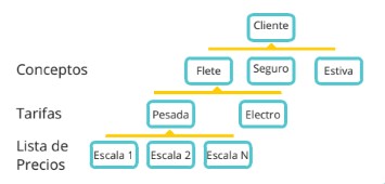 El esquema es muy simple: está dividido en cuatro (4) grupos: el cliente, los conceptos, las tarifas y las listas de precios.